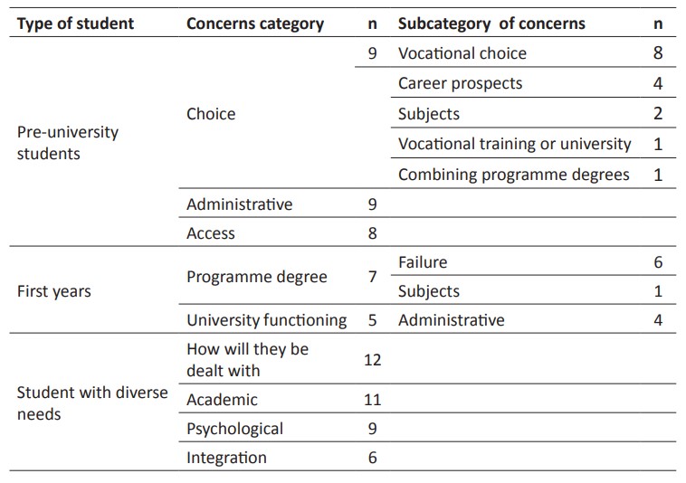 From the Guidance Service, the students’ concerns or needs were presented according to their area of work, and the following types of students were mentioned a) pre-university students (n=16), b) first years (n=12); and c) student with diverse needs (n=25) (Table 3).: