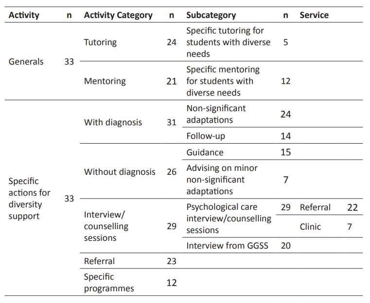The interviewees mentioned Guidance Services’ individual attention activities aimed at all students (n=33) and specific actions for students requiring diversity support (n=33). All of them are voluntary in nature (Table 4).