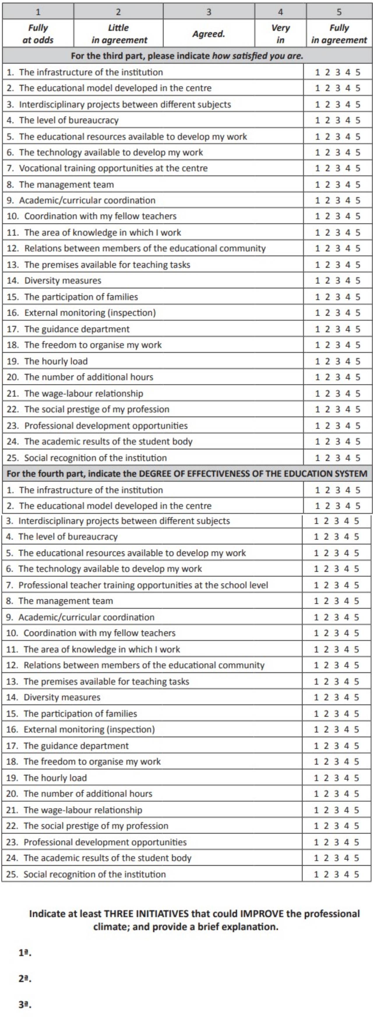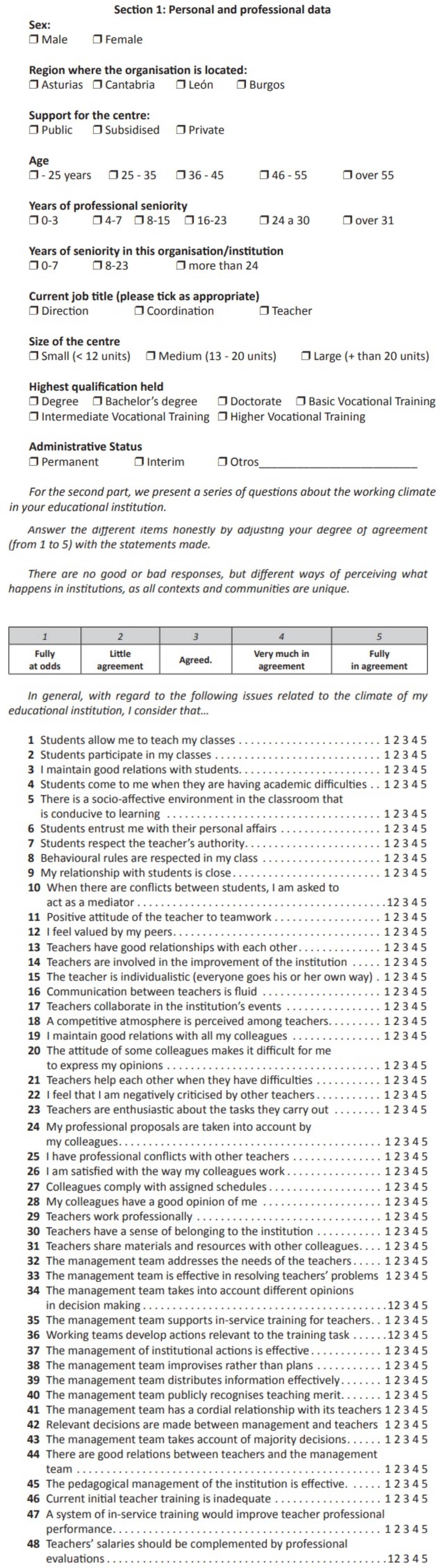 The questionnaire was finally structured into 48 items to assess the professional climate, 25 items to assess satisfaction and 25 items to assess effectiveness, in order to provide a picture of the professional teaching climate in schools (see Annex I). This instrument was applied to a sample of teachers classified by socio-demographic characteristics, identified by gender, geographical location, size of the educational institution, years of teaching experience, years of experience in the same educational institution, department or area of specialisation, educational levels at which they teach, current position within the educational institution, level of qualification and administrative status. The use of the questionnaire and the composition of the sample aimed to collect accurate and relevant data to help improve working conditions and the quality of education in schools in this autonomous community.