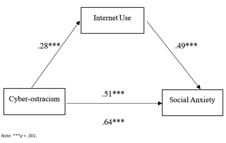 Correlational results showed a significant and positive association in all variables through Pearson’s correlation. The values were: r = .35 in the relationship between cyber-ostracism and Internet use; r = .40 between social anxiety and Internet use; and r = .44 between cyber-ostracism and social anxiety.