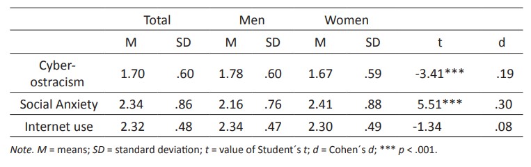 Table 1 shows the means, standard deviations, Student’s t-test and effect size for the three study variables. The data indicated that there were differences between men and women in cyber-ostracism, with a higher mean in men, and in social anxiety with higher scores in women. There were no significant differences in Internet use (see Table 1).