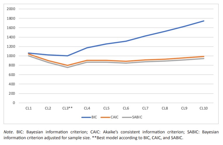 The BIC, CAIC, and SABIC criteria were used to determine the optimal number of latent profiles. Ten different models ranging from 1 cluster (representing complete homogeneity in the sample) to 10 clusters were evaluated. The three-cluster model obtained the lowest values for all three criteria, indicating that it was the most parsimonious and best fit for the data, as shown in the figure below.