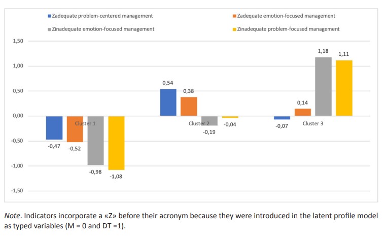 Figure 2 shows the three profiles corresponding to the three clusters. Each cluster represents an underlying pattern of students’ coping styles, and the standardized average of each indicator is shown. An analysis of the behavior of each profile, as well as the associations with the model’s covariates, is presented below: