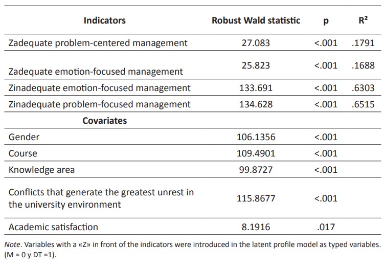 Once the number of clusters (3 latent profiles) was determined, we proceeded to evaluate the significance of the indicators used to classify the groups and of the covariates that contributed to their characterization. Regarding the four indicators, it was found that the Wald statistic showed significance levels below .001, indicating that the four indicators used were statistically significant for the segmentation of the sample into three distinct groups based on the perception of adequate problem-focused coping, adequate emotion-focused coping, inadequate emotion-focused coping, and inadequate problem-focused coping. The percentage of variance explained by these four indicators ranged from 16.88% for adequate problem-centered coping to 65.15% for inadequate problem-centered coping. As for the covariates, significant effects were observed for gender, course, level of studies, area of knowledge, conflicts that generate greater stress in the university context and academic satisfaction, which were used to characterize the groups obtained (Table 3).