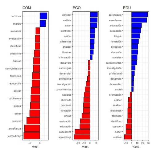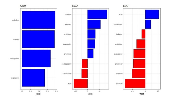 Finally, Figure 9 shows that the words ‘prácticos’ (practical), ‘trabajos’ (assignments), ‘participación’ (participation) and ‘evaluación’ (assessment) are characteristic of the COM disciplines as they describe the assessment methods and instruments. ‘Pruebas’ (tests), ‘examen’ (exam), ‘prácticas’ (practices), ‘evaluación’ (assessment) and ‘prácticos’ (practical) characterise the ECO discipline and ‘aula’ (classroom) and ‘actividades’ (activities) feature most in EDU.