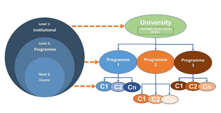 Approaching the curricular design from the constructive alignment is considered a fundamental principle for the university level teaching-learning process (Ajjawi et al., 2023; Barboyon Combey & Gargallo López, 2022) not only in the subjects/ content but also at an institutional level. Biggs et al. (2022) thereby propose three levels of ILO (institutional, programme and unit) which should be coherent to each other when rolled out. It should also be considered that the RD 882/2021 states that the ILO must be in line with QF-EHEA Master’s degree level in the European Higher Education Area and be coherent to its designation, its discipline and the graduate profile which, inexorably, requires considering various levels or standards and a benchmark teaching excellence model for the roll out (Figure 2).