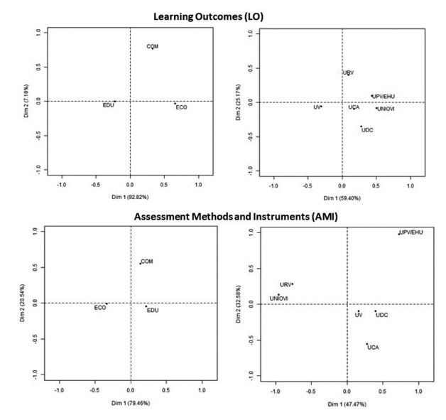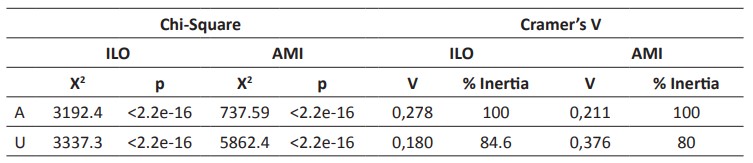 Using Cramer’s V values, we can see that the values are equal to or higher than 0.2. This can be interpreted as a moderate association, according to the rule which determines values between 0.2 and 0.6 as moderate. In the case of the ILO and university, there is an association of 0.18. The total inertia percentages for the first two axes of each factorial axis demonstrate values over 80% in all cases.