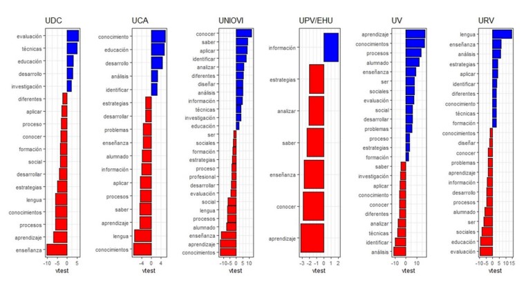Figure 6 presents the over-represented (blue) and under-represented (red) words in the ILO descriptions depending on the university. For example, at the UCA, the word ‘conocimiento’ (knowledge) is over-represented as it is used 102 times, and this represents 0.36% of use as opposed to 0.21% of use in all the universities as a whole.