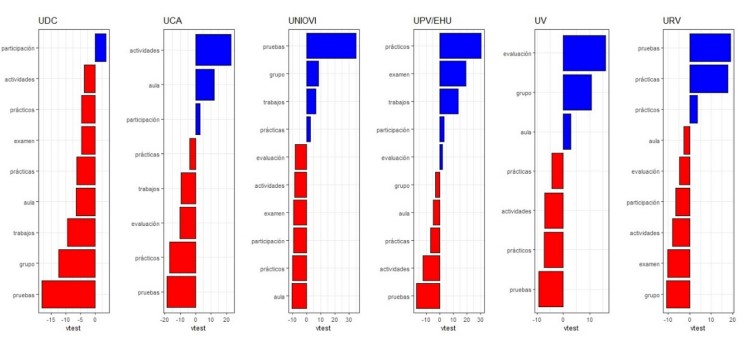 Along the same line, Figure 7 shows the characteristic words referring to the AMI. The words ‘actividades’ (activities), ‘aula’ (classroom) and ‘participación’ (participation) are characteristic of the UCA. Participation appears over-represented in three universities as overall it is used in 1.57% of the descriptions, and the use in these universities represents 2% (UDC), 1.8% (UCA) and 2.1% (UPV/EHU).