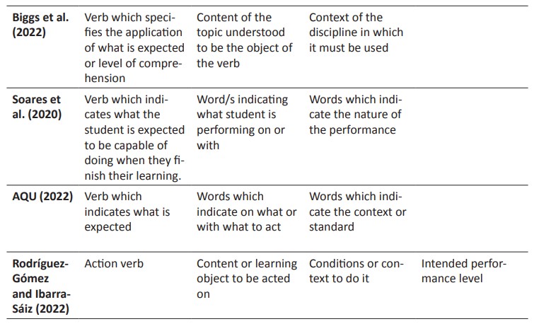 On the other hand, it is worth mentioning that the definitions are limited for a high percentage of the ILO described, as they do not contain all the components in Table 1 that so many agencies like AQU (2022) and authors such as Biggs et al. (2022), Rodríguez-Gómez & Ibarra-Sáiz (2022) or Soares et al. (2020) consider necessary for proper formulation. In this respect, this confirms what Astigarraga Echeverría et al. (2020) mention as a great difficulty in the design and conceptualisation for curriculum change, as teachers are not sure how to identify and describe the ILO and confuse them with skills.
