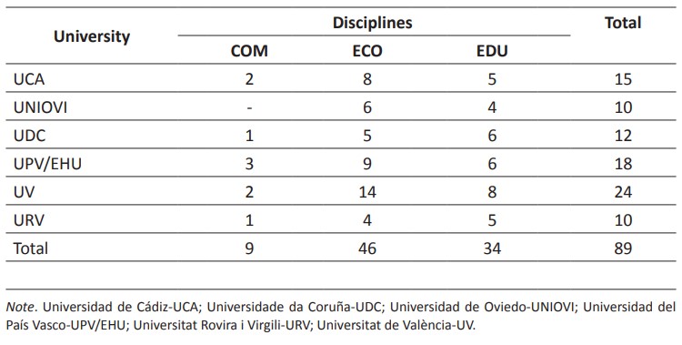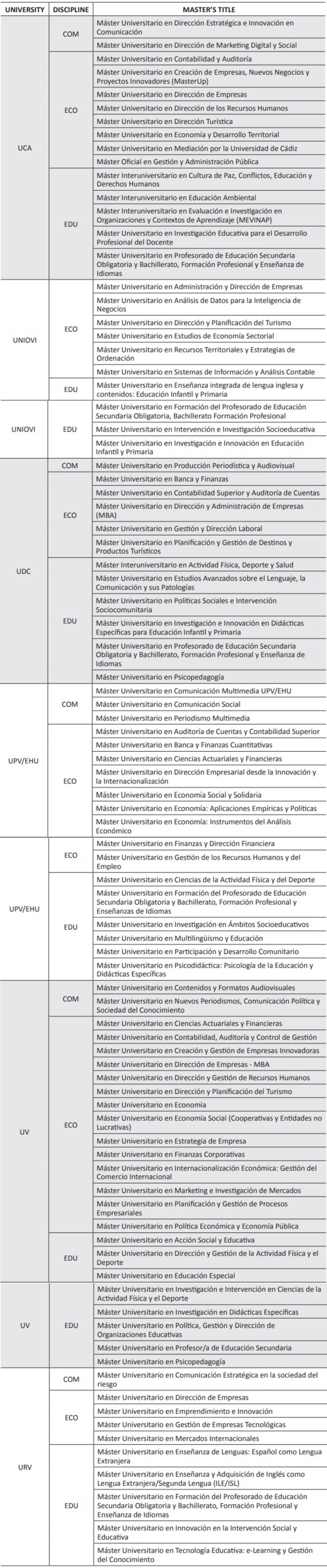 The project focused on analysing qualifications given in the universities, classified as level 3 in the Spanish Framework of Higher Education Qualifications (master’s degree) due to the specialisation and variability of these courses between various universities. Furthermore, a selection was made from the Social and Legal Sciences area, due to the project’s limited human and time resources, which meant that only Social Sciences qualifications taught at each university were analysed (See Appendix I). A total of 89 master’s degrees were analysed (Table 3): 38.20% were from the discipline of Education, 51.69% from Economics and Business Studies and 10.11% from Communication, specifically understanding these as the disciplines for this study.