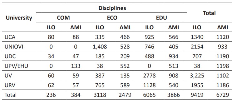 As for ILO, 33.6% (1981) are assessed as authentic, to the extent that their definitions are focused on the action and the professional context. This produces an authenticity average of 4.01 (on a scale from 1 to 5), ranging between an average of 3.81 from UNIOVI and 4.77 from the UDC, and 3.97 from Education compared to 4.26 from Communication.