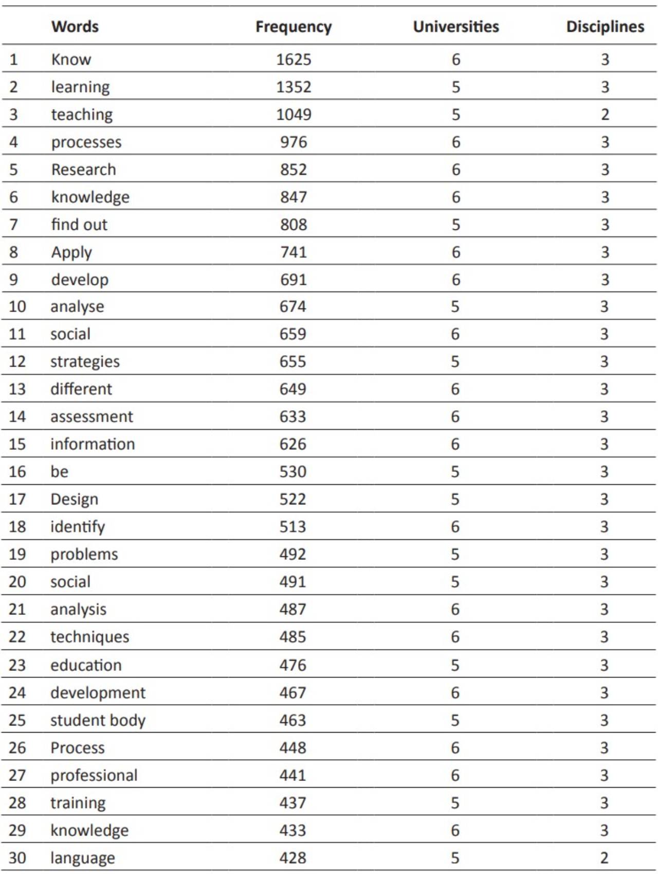 In the case of the ILO, a total of 9419 definitions were analysed, using 5642 different words. Table 5 presents a dictionary of the 30 words which are used 400 times or more, and the number of universities and discipliines where they appear. Consequently, the most frequent word ‘conocer’ (know) is used in 1625 definitions, found in all six universities and in the three disciplines. The word ‘analizar’ (analyse) is used 674 times and it is present in five universities and all three disciplines.