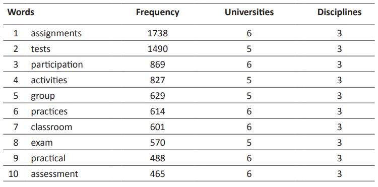 Regarding the second question in the research, referring to which AMI are specified for monitoring and assessment of the ILO, the textual analysis tells us that the most-used terms are: assignments, tests, participation, activities, group, practices, classroom, exam, practical and assessment. The AMI are clearly diverse, which fits with the study by Ibarrra-Sáiz et al. (2023) and reveals a more innovative evolution regarding prior contributions by Panadero et al. (2019) which highlight more traditional practice.