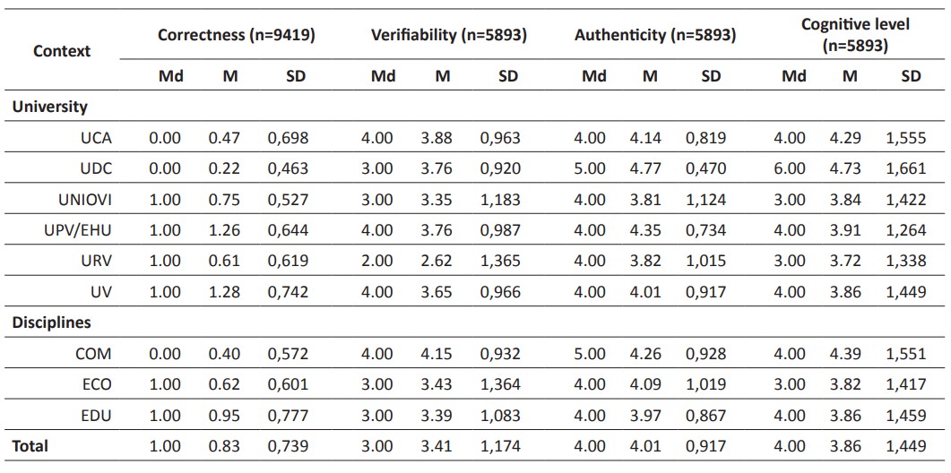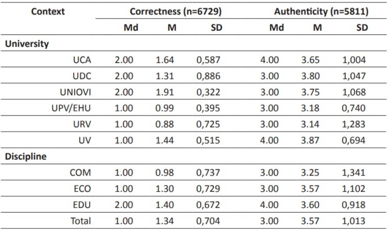 Out of the 5811 assessment methods and instruments defined correctly or with limitations, 22.4% (1301) are scored as authentic, as they are focussed on the action and the professional context. Regarding the AMI, 39.9% (2318) are at an intermediate level, with an average authenticity of 3.57. The averages range between 3.14 from the URV and 3.87 from the UV; regarding the discipline, they range between 3.25 from Communication and 3.60 from Education.