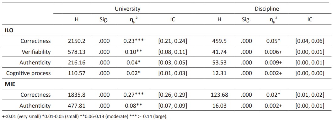 The Kruskal-Wallis H-test was performed to check the significance of the differences described above, and its results are presented in Table 12, alongside the effect sizes (ηH²) and the confidence intervals (CI). The differences between the evaluations carried out according to the university and disciplines are statistically significant (p<.05). In the case of the universities, the effect size varies, although correctness provides the greatest effect size both in the ILO (0.23) and in the AMI (0.27), that can both be considered as large. In terms of verifiability, it is moderate (0.10) and regarding the authenticity and the cognitive processes, the effect size is small in the ILO (0.04 and 0.02 respectively); and in the authenticity of the AMI (0.08). Regarding the disciplines, the effect sizes are remarkably small or very small.
