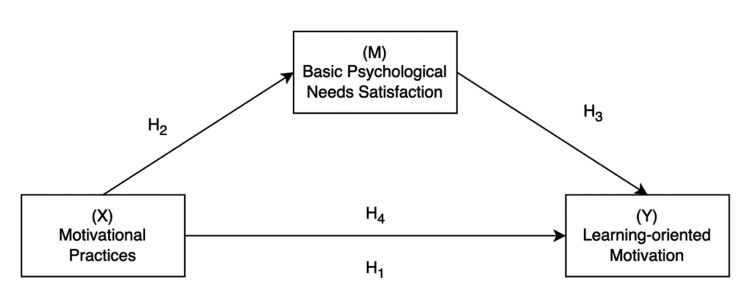 According to the above, we seek to test four hypotheses derived from the theoretical review that account for the directionality of the variables: exogenous (motivational teaching practices), exogenous mediating (basic psychological needs), and endogenous (learning-oriented motivation), considering the paths of simple mediation analysis.