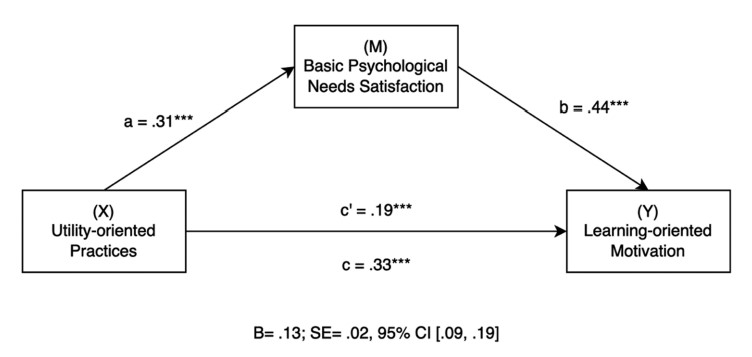 Figures 2, 3, and 4 show the simple mediation models, including the Basic Psychological Needs Satisfaction, mediating the relationship between the three practices perceived by the students as motivating and learning-oriented motivation. Mediation analysis 1 (utility-oriented practices): According to the standardized coefficients, it was observed for the case of utility-oriented teaching practice that there is a significant overall effect on learning-oriented motivation (r = .33, p < .001; path c) and also a significant effect on satisfaction of basic psychological needs (r = .31, p < .001; path a). In addition, a significant effect of basic psychological needs satisfaction on learning-oriented motivation is observed (r = .44, p < .001; path b).