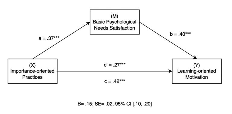 Mediation analysis 2 (importance-oriented practice): For this case, it was observed that importance-oriented teaching practice has a significant overall effect on learning-oriented motivation (r = .42, p < .001; path c) and also a significant effect on satisfaction of basic psychological needs (r = .37, p < .001; path a). In addition, basic psychological needs satisfaction significantly affects learning-oriented motivation (r = .40, p < .001; path b).
