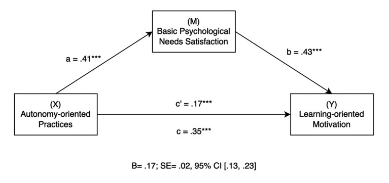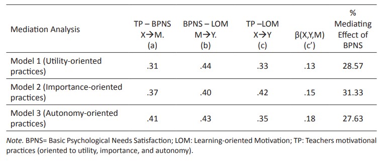 The indirect effect is explained by the presence of a mediating variable, in this case, basic psychological needs, which indicates that the practices implemented by teachers can increase learning-oriented motivation on the condition that the three basic psychological needs of competence, relatedness, and autonomy, proposed by the Self-Determination Theory, are satisfied.