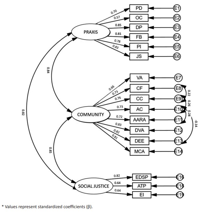The DCRPS variable achieved a Cronbach’s alpha coefficient of .942. The coefficients obtained for the latent variables were α = .891 (Educational Praxis); α = .915 (Community); α = .736 (Social Justice). The McDonald’s omega coefficients were .943 for DCRPS; ω = .895 (Educational Praxis); ω = .916 (Community); ω = .738 (Social Justice). Those values indicated adequate reliability in so far as they were aligned with the recommended values of the psychometric literature, thereby confirming the internal consistency of the scale and its dimensions.