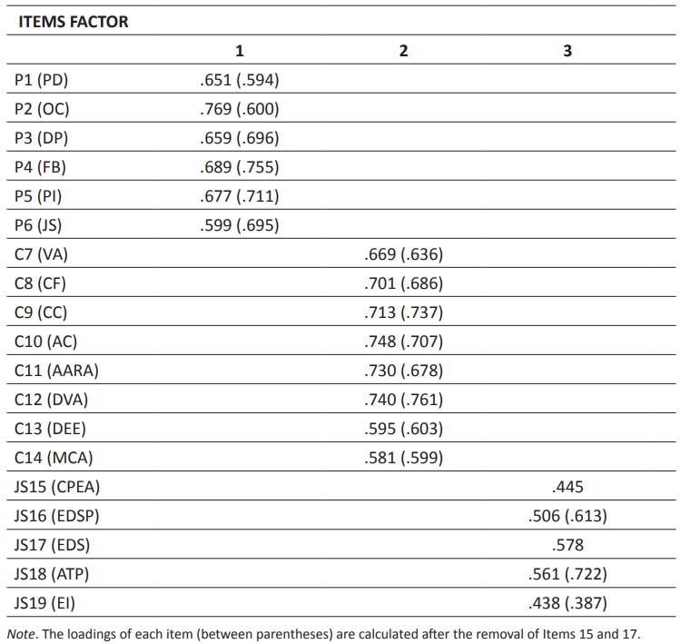 Exploratory Factor Analysis (EFA) was first conducted to analyse the structural validity of the scale. It was observed that Item 15 of the Spanish version of the scale was in a different dimension compared to the original model. The results of the EFA (Table 2) revealed a structure consisting of 3 dimensions. It was noted that the Spanish version of the instrument was not aligned with the original scale, as Item 15 appeared in the Social Justice dimension rather than in the Community dimension. Subsequently, following the EFA results, which were well aligned with the original authors’ model except for Item 15, a Confirmatory Factor Analysis (CFA) was performed to confirm this model. After conducting the CFA, the fit indices were: χ² = 624.65, p < .01; CFI = .922; TLI = .910; IFI = .922; RMSEA = .077; AIC = 706.653. However, it was observed that Items 15 and 17 had low loadings of 0.49 and 0.36, respectively. So, it was decided to remove those items after the CFA, because their loadings were below 0.5.