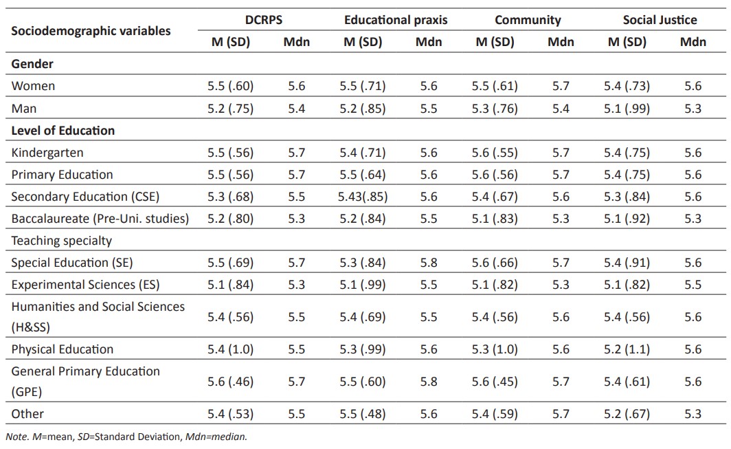 Before analysing each variable, information on the item values of the scale and its dimensions is presented to provide a general overview of the results. Considering a minimum score of 1 and a maximum of 6, the items with the highest mean scores were: «I consider it important to collaborate with colleagues» (5.75); «I consider it important to use dialogue as a way to understand students’ lives outside the classroom» (5.61). The items with the lowest scores were: «I consider it important to take students’ contributions into account when setting classroom rules» (5.25); «I am willing to analyse my own identities (cultural, professional, religious, gender, etc.)» (5.30). Among the dimensions, the highest score was obtained by Community (5.50) and the lowest by Social Justice (5.37). Regarding the variables considered, Table 3 shows each one in relation to the dimensions together with their mean, median, and standard deviation.