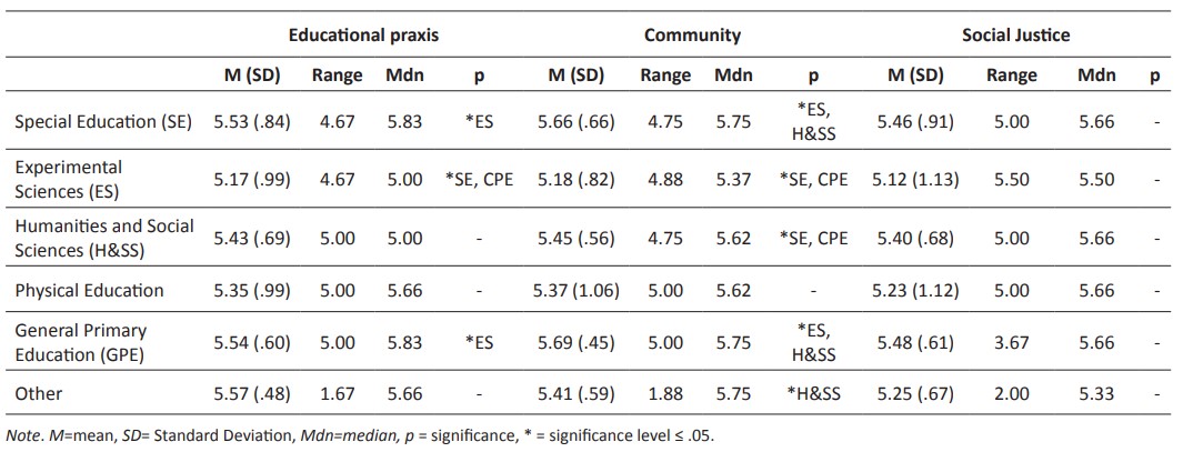 The Kruskal-Wallis test with Bonferroni post hoc analysis H (5) =37.321, p< .001 revealed statistically significant differences between specialties Humanities and Social Sciences (H&SS)-GPE; Experimental Sciences y General Primary Education ES-GPE, and ES-Special Education (SE) in the DCRPS variable, with a moderate effect size εR2 =0.06, where the median was highest for GPE (5.76). Regarding the dimensions, Educational praxis H (5) = 15.694, p=.008 and Community H (5) = 61.683, p<.001 showed statistically significant differences, with a low effect size εR2 = 0.02 and a high effect size εR2 =0.1, respectively. The Bonferroni-corrected post hoc test revealed those differences between the specialties of ES, SE, and GPE in the Educational praxis dimension, and between ES, H&SS, SE, and GPE in the Community dimension. Results that pointed to a higher disposition towards ECR within the fields of SE and GPE, both in the Educational praxis and the Community dimensions, as shown by the median, range, and mean data (Table 4).