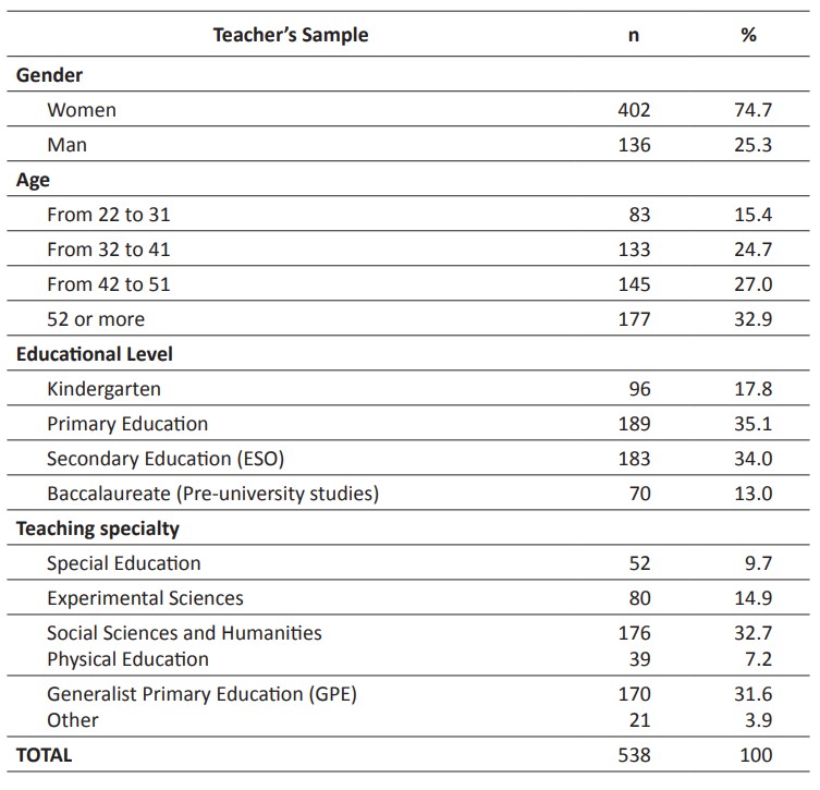 The appropriate sample size was determined by following the common cut-off criterion of at least 200 responses and a minimum ratio of 10 participants per item; that is, each item should have at least 10 responses (Kline, 2014; Lloret-Segura et al., 2014). The original questionnaire contained 19 items, thereby requiring a minimum of 190 responses to meet the criterion of 10 responses per item. A total of 538 teachers from various educational levels and different provinces in Spain voluntarily and anonymously responded to the online questionnaire designed to validate the scale. The study adhered to the guidelines of the Declaration of Helsinki (Declaration of the World Medical Association), ensuring ethical-philosophical commitment and unwavering respect for human dignity, privacy, physical and moral integrity, and guaranteeing the protection of personal data throughout the research. The research project had also received a favourable report from the Bioethics Committee of the relevant university (RI 1105/2023).