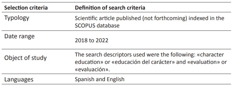 The articles were selected in four stages, on the basis of the previously defined criteria. The first stage set the equation to search for articles in the SCOPUS database published between 2018 and 2022 that contained the descriptors «character education» or «educación del carácter» and «evaluation» or «evaluación».