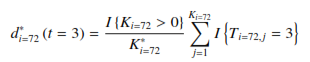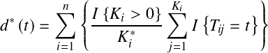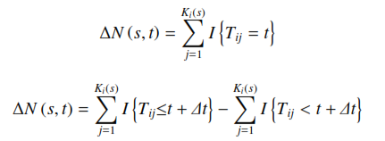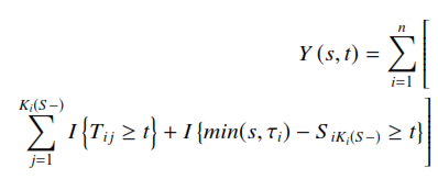 Ki*(t) is the number of uncensored recurrent events for unit i, and Kiis the number of recurrent events for subject i. The function {.} is one if the condition on breakers is true and zero on other case. So, let