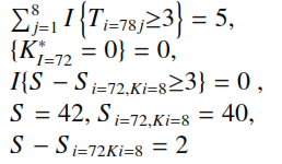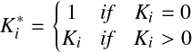 As, {.} is one if the condition is true and zero in other case, as Ki≥0 is true, then {Ki=72∗ > 0} = 1, so