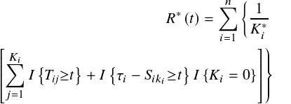 Ri∗ is the summation of the weighted average the total number of observed uncensored recurrent times for a subject that are greater than or equal to t. Ri is the total mass of the risk set at time t and it is calculated as,