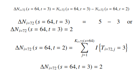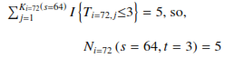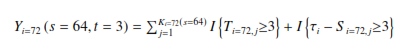 Example Nº 3. For this example, also we use TBCplapy dataset of TestSurvRec package. On the procedure, we explicate as to estimate the counting processes of the estimator PHS for the patient with id equal to 72. To continuation, we shows the calculates, For the calculate of Ni(s; t) is used the equation (6), i = 72, s = 64 and t = 3,