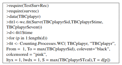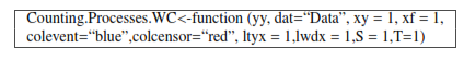We designed two functions in R language. We designed “Counting.Processes.WC” and “Counting.Processes.PSH” function to calculate of the counting processes of WC and PSH. With the help of the functions, the users can be able of to plot the occurrences of an event for number of wished units. The user can change the total units to plot. We do not show the routines of these functions on this work. However, they can be solicited way e-mail of the author. The author included these functions on library of a new version of TestS urvRec package of R − CRAN.