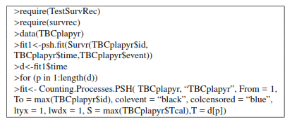 Example Nº 4. For this example, also were use the TBCplapy dataset of the TestSurvRec package. On the procedure, were estimated the counting processes of the estimator PSH for all patients and was used the function created on R language. Code on R-language for the estimation of PSH estimator.