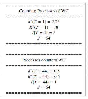 To continuation, we show an abstract of the output of the function “Plot.Counting.Processes.WC”. On the abstract, we present the results of the outputs of the first and the last calculations of the counting processes for the units of study, as it is appreciate below,