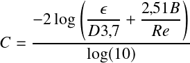 Siendo el comportamiento de los parámetros A, B y C, los que se muestran en las ecuaciones (7), (8) y (9) respectivamente, estimado el número de Reynolds según la ecuación (10).