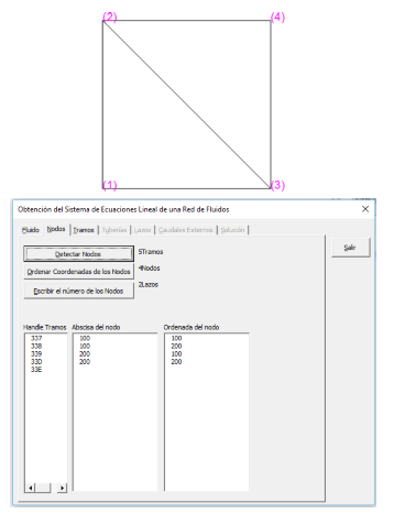 Al pulsar el botón DetectarNodos, la aplicación extrae de la red dibujada, los identificadores (Handle) de los objetos como línea, las coordenadas de sus extremos (nodos) sin repetirlos y la longitud de cada línea la cual se almacena en una matriz denominada matTuberias. Por lo tanto, con estos datos el sistema obtiene y muestra por pantalla la cantidad de tramos, nodos y por ende la cantidad de lazos disponibles para crear el sistema de ecuaciones de la red de fluidos.