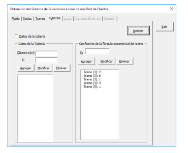 Los valores del coeficiente de resistencia para cada tubería se introducen como datos por teclado en la pestaña Tuberías del programa (Figura 10), con éstos se crea el sistema inicial de ecuaciones; los valores de los caudales externos también se introducen a través de la interfaz. El sistema de ecuaciones está conformado por (J-1) ecuaciones de continuidad en los nodos y (L) ecuaciones de balance de energía en los lazos.