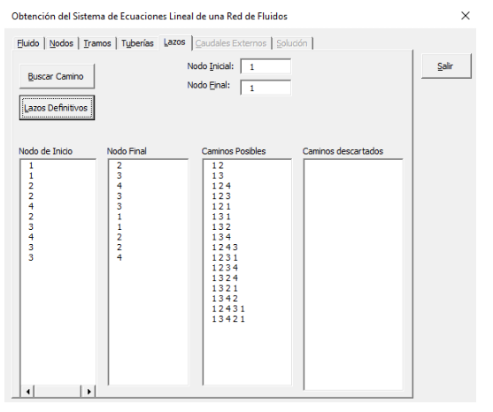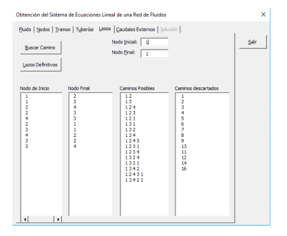 Los lazos se definen en la pestaña Lazos mediante el botón Buscar Camino con un recorrido en profundidad, de tal manera de obtener todas las trayectorias posibles que forman un lazo cerrado en la red. Finalmente con el botón Lazos definitivos, se definen los lazos necesarios y suficientes para completar las ecuaciones requeridas para completar el sistema de ecuaciones representativo de la red de fluidos (Figura 11). Para la red en el centro de la ventana se presenta la lista de adyacencia de los nodos y la cantidad posible de caminos encontrados en total 16.