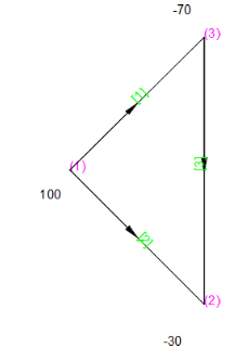 El análisis de la red se realiza partiendo de la técnica de programación mediante una búsqueda en profundidad. En primer lugar se necesita conocer cuál es el conjunto de conexiones existentes entre las tuberías que conforman la red; por ejemplo, en una red sencilla de tres tuberías tal como se muestra en la Figura 14, se tiene el flujo externo en los nodos 1, 2 y 3 con valores de 100, -30 y -70 [m3/h] respectivamente, el valor positivo indica que el flujo entra a la red y el valor negativo que sale de la misma.