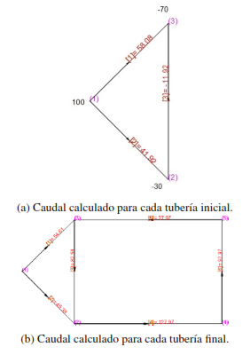Por último, una vez que el programa determina la topología de la red, crea una matriz cuyo contenido son los coeficientes de las ecuaciones de continuidad en los nodos y de balance de energía en los lazos, finalmente resuelve los sistemas de ecuaciones necesarios mediante la aplicación del método teórico lineal; el resultado de este procedimiento permite obtener el valor del caudal de cada tubería de la red, quedando reflejados dichos en la Figura 15(a) para cada tubería para cada tubería.