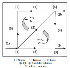 Las redes de tuberías pueden ser abiertas, cerradas y mixtas; y son sistemas de distribución de fluidos que están constituidos por tramos de tuberías, puntos de toma y descarga de fluido [7]. Un tramo es una tubería que une dos nodos, un nodo es un punto de confluencia de las tuberías o de empalme con tanques externos, y un lazo es el conjunto de tramos que forman un circuito cerrado.