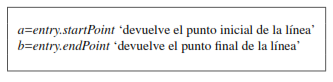 Estas coordenadas se deben almacenar en variables de tipo Variant, las cuales se manejan posteriormente como un vector de tal manera que si se almacena un punto inicial mediante la instrucción a=entry.startPoint, la abscisa se obtiene con a(0) y la ordenada con a(1). Adicionalmente, se pueden obtener otros datos como la longitud de la línea y su identificador mediante los métodos entry.Length y entry.Handle.