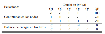 En la pestaña Solución, finalmente con el botón Llenar el Sist. Ec. se crea la matriz mediante la obtención de los coeficientes del sistema de la red conformada por las ecuaciones de continuidad en los nodos y de balance de energía en los lazos. Así, en la Tabla 1 se muestra la matriz resultante con los valores obtenidos a través de las respectivas ecuaciones tanto en los nodos como en los lazos de acuerdo al siguiente ejemplo: