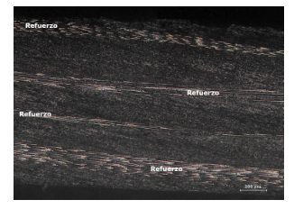 El contenido de porosidades representa entre 4 y 10% de las áreas de las secciones transversales sometidas a estudio. Las regiones ricas en resina ubicadas entre las capas de la fibra de refuerzo, poseen una gran cantidad de imperfecciones, que son generadas debido a la extracción de resina por la presión de vacío y por la imposibilidad de eliminar todo el aire atrapado en el laminado, problema que puede acentuarse con el incremento de la viscosidad de la matriz epoxi, lo cual incide de forma negativa sobre las propiedades mecánicas del material [7, 8, 9]. La micrografía de la lámina fabricada por el método de BVCV, muestra una parte de gran calidad con la ausencia total de porosidades para el aumento utilizado.