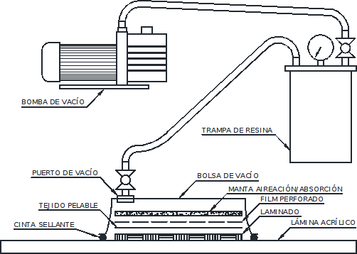 En la Figura 1, se muestra una representación esquemática de la técnica tradicional de BV. Inicialmente, las fibras de refuerzo se disponen sobre el molde que posee la geometría de la parte a fabricar, a medida que son impregnadas con resina. Seguidamente, se colocan los consumibles para el vacío (tejido pelable, film perforado y manta de aireación/absorción) y el laminado es cubierto mediante la bolsa de vacío, que se fija al molde con cinta sellante, después de ubicar un puerto de vacío en el interior de la misma.
