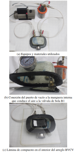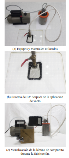 Para determinar la efectividad de la técnica de BVCV en la elaboración de partes de alta calidad, se fabricaron láminas de material compuesto de 50x50 mm, constituidas por cuatro (4) capas de fibra de carbono twill 2x2 3k, y resina epoxi de dos componentes, mediante los procesos de BV y BVCV, comparando las imperfecciones presentes en las superficies de las láminas y el contenido de porosidades en el interior de las mismas con la técnica de microscopía óptica.