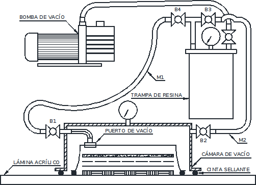 Seguidamente, se conecta el puerto de vacío a una pequeña manguera en el interior de la cámara que conduce a la válvula de bola B1, la cual regula el flujo de aire hacía la trampa de resina a través de la manguera M1. La válvula de bola B2, cumple con una función similar pero regulando la presión de aire en el interior de la cámara; para ello se conecta con la trampa de resina a través de la manguera M2. La cámara de vacío se fija al molde mediante cinta sellante que se ubica por fuera del perímetro de la bolsa de vacío. Durante la fase inicial del curado de la resina, se mantienen abiertas las válvulas de bola B1, B2, B3 y B4, se aplica la presión de vacío requerida para desgasificar el laminado tanto en la cámara como en la bolsa de vacío, evitando así que se ejerza presión sobre el material compuesto, mientras el aire atrapado escapa hacia el exterior a través de la manguera M1. Cuando la resina alcanza el punto de gel, se cierran las válvulas de bola B2 y B3, se desconecta la manguera M2 y se abre progresivamente la válvula de bola B2, liberando el vacío en la cámara, produciéndose un diferencial de presión entre la cámara y el interior de la bolsa, por lo que ésta colapsa sobre el laminado, ejerciendo fuerza sobre el mismo, compactándolo y manteniendo los refuerzos en la posición correcta durante el resto de la fase de curado de la resina epoxi. En el interior de la bolsa siempre debe aplicarse máxima presión de vacío.